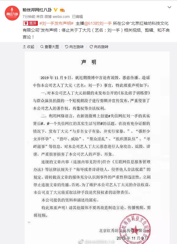 11月9日,主播@613的刘一手所在公会“北京红袖坊科技文化有限公司”发布声明:停止关于丁大元(艺名:刘一手)相关视频、剪辑、和不良言论!