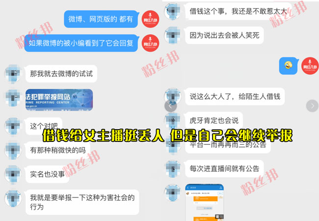 虎牙直播平台用户每次进直播间都会再三提醒“避免上当受骗”,之前该财主也有想过进行报警,但是因为借钱给女主播的事情,说出去觉得挺丢人的。而且自己目前身在西班牙,要处理这些事情相对来说比较麻烦。