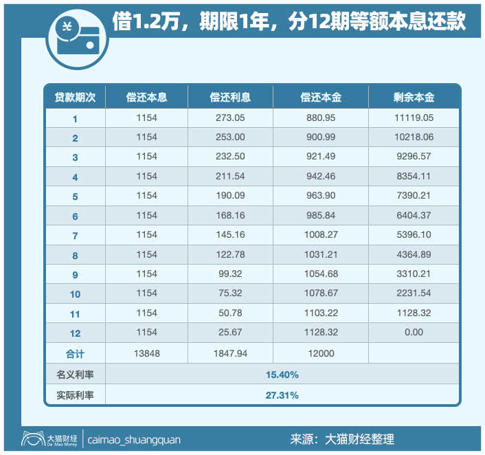 但是从机构的角度来看,你每次还掉的本金和利息都可以继续拿去周转、创造更多利润,按照内部收益率计算的话实际借款利率高达27.31%。