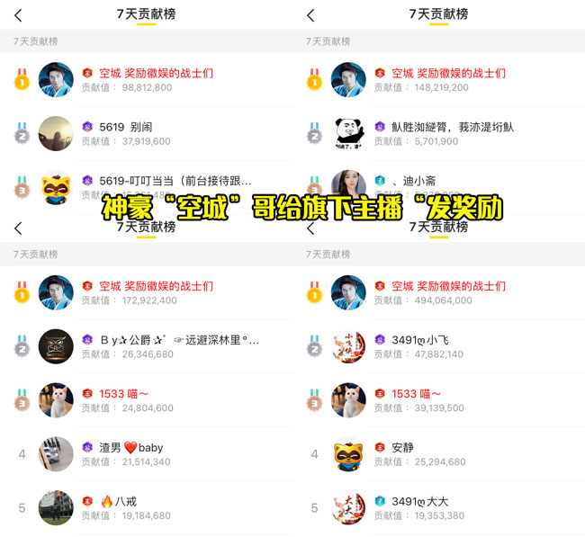 其中徽娱伊人、霖霖幺、小迪娅、memo酱、小璐一等主播都收到了空城哥打赏的礼物。