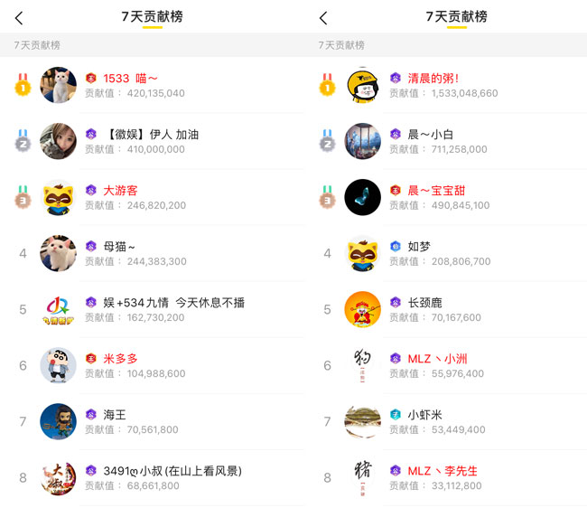 这位主播“1533小表妹”本处于领先,之后芮甜甜开抢,神豪洋洋哥、帝王蟹等、晨小白等前来豪刷,很快就反超占据第一。