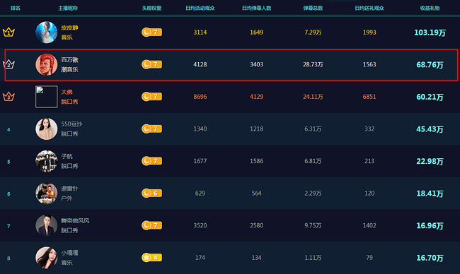 其次就是直播间的榜单,也确实是稳居舞帝主播前三之列。为此百万锹也是开玩笑,说自己现在也算是舞帝的顶梁柱了。