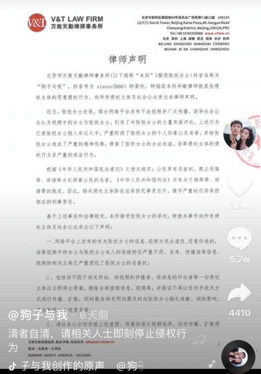 网友表示,目前该抖音主“狗子与我”还在努力抗争,坚持说流传的主人翁不是自己,下面是她的自证,今天下午前抖音账号下也放出了一张“律师函”…