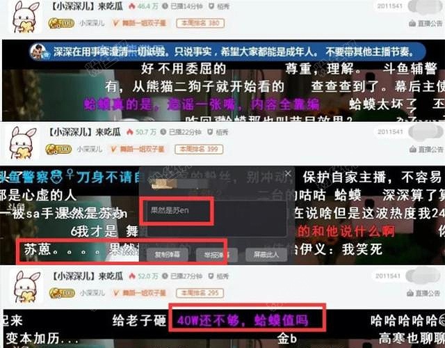 其中,苏恩还嘲讽了小深深的真实人气不如她,质疑她和超管关系好所以排行在前面等,还有关于女主播“彩虹糖”的事情等。
