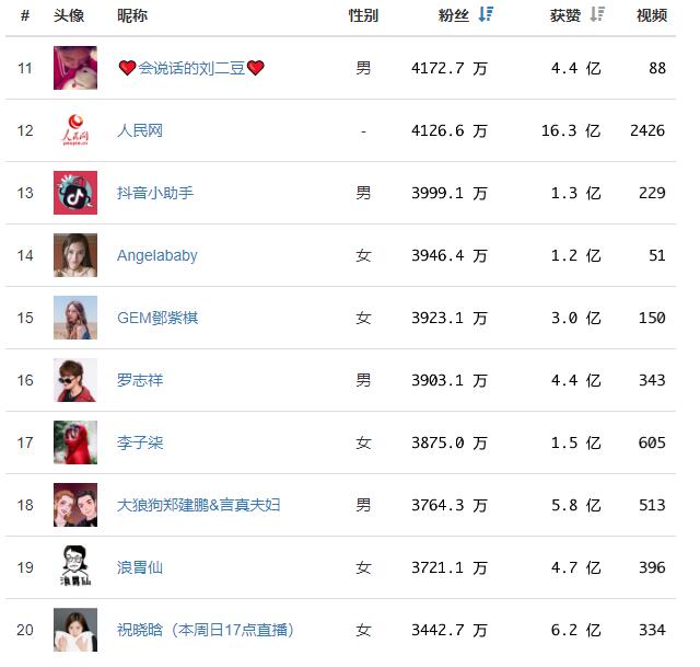 抖音网红粉丝关注前50名排行榜,第一名已经破亿