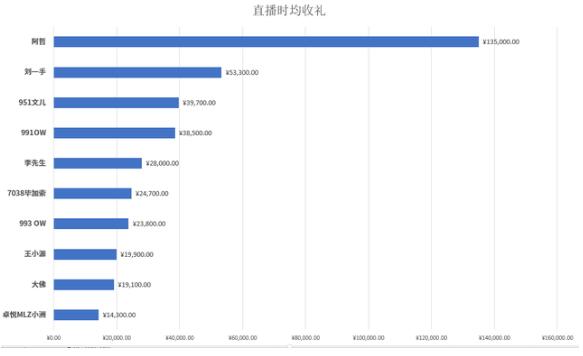从头榜数据统计看到,阿哲1小时直播礼物流水13.5万,其次是刘一手5.33万,文儿3.97万。