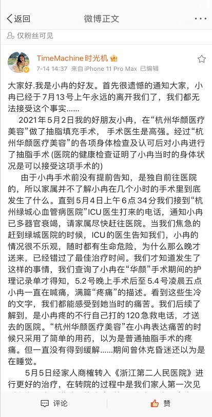 7月13日上午@TimeMachine时光机不幸离世,她的好友发长文为她讨公道,长文中写道好友小冉因为在医疗美容院做抽脂填充手术,因皮肤感染器官衰竭,痛到忍不住求救。