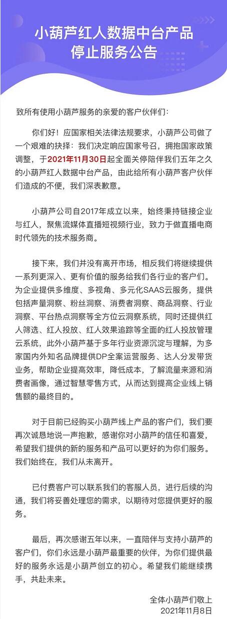你们好!应国家相关法律法规要求,小葫芦公司做了一个艰难的抉择:我们决定响应国家号召,拥抱国家政策调整,于2021年11月30日起全面关停陪伴我们五年之久的小葫芦红人数据中台产品,由此给所有小葫芦客户伙伴们造成的不便,我们深表歉意。