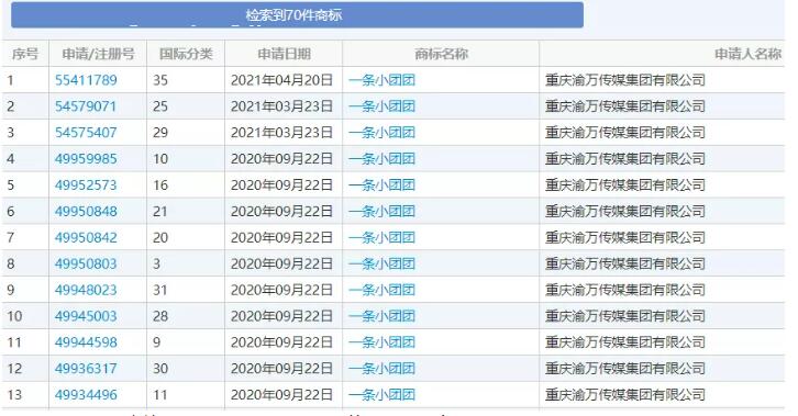 她的这个名字“一条小团团”已经被小团团目前的公会“重庆渝万网络传媒有限公司”注册成为多个分类商标。