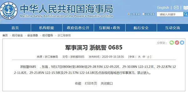 台媒称,9月以来,解放军已在东海公开发布两次军演,第一次是8日早上8时至11日晚上6时;第二次是12日早上8时至晚上6时在象山沿海。