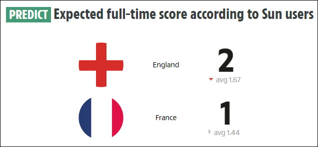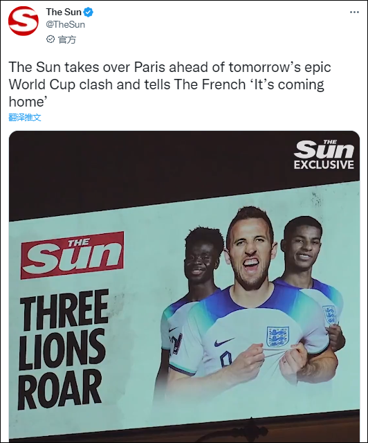 该媒体还引用球迷的话对这场比赛的结果进行了预测:最终,英格兰队将以2-1的成绩击败法国队,这将是一场历史性的胜利,凯恩将“控制”法国。