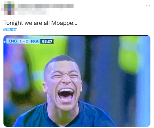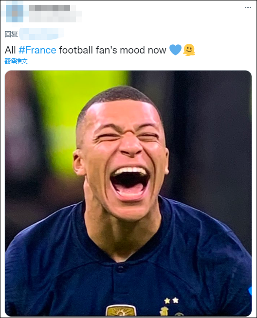 法国队球迷也纷纷用姆巴佩的表情表达喜悦,“今晚,我们都是姆巴佩”。