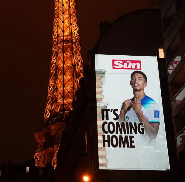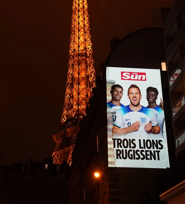 当地时间9日,《太阳报》在法国巴黎购买了多块LED广告屏,刊登英格兰队球员的巨幅海报。