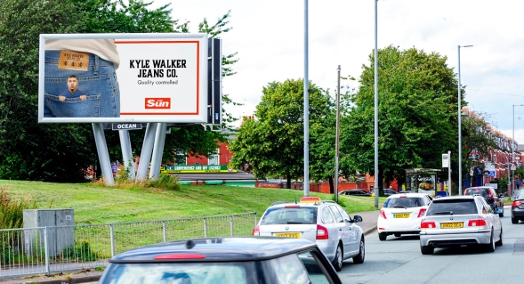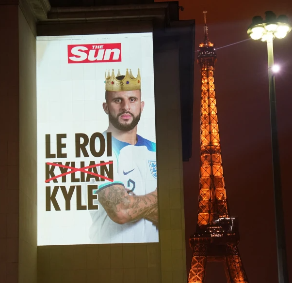 刊登牛仔裤广告后,《太阳报》“一不做,二不休”,直接将广告做到法国队“家里”去了。当地时间9日,《太阳报》在法国巴黎购买了多块LED广告屏,刊登英格兰队球员的巨幅海报。