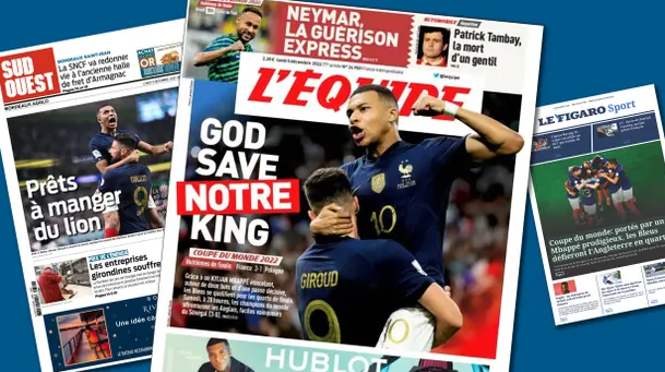 这场万众期待的比赛开始前,两国媒体先隔空展开了一场“较量”。法国24电视台预言,“有姆巴佩在,一切皆有可能”;法国知名体育媒体《队报》刊发姆巴佩的照片,并放话“上帝会拯救我们的国王”(God Save Notre [Our] King)。