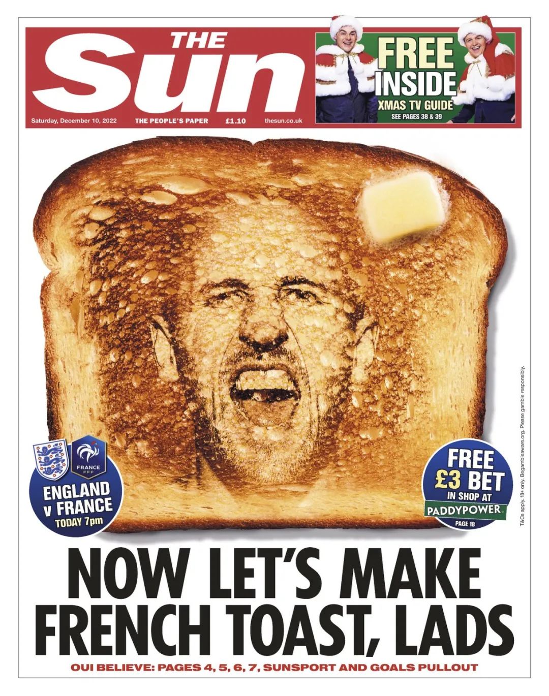 而英国《太阳报》为给自家球员加油打气,花样百出。10日,该媒体在头版发布了一片吐司照片,吐司上印有英格兰当家球星、中锋哈里·凯恩大笑的头像,右上角是一块正在融化的黄油,头像下方配文写道,“现在,让我们做法式吐司吧!”