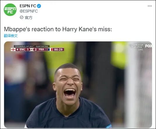 实际情况:比分倒是猜对了,只是被法国队送回了家。当英格兰队队长凯恩踢飞点球后,法国队的姆巴佩直接笑出了表情包……今天,姆巴佩大笑的一幕在Twitter上疯传,有法国队球迷调侃,“今晚,我们都是姆巴佩”。