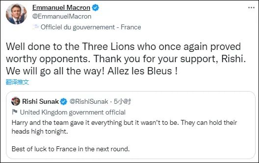 值得一提的是,这场万众期待的比赛结束后,法国总统马克龙和英国首相苏纳克也在社交媒体上进行了互动。苏纳克发文表示,“哈里(凯恩)和整个队伍付出了一切,(虽然)结果不尽人意,(但)他们可以昂首离开现场。期待法国队在下一轮比赛中好运。”