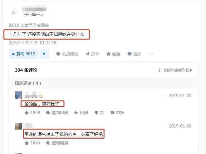 点赞最多的一条回复是:“这么多年不明白她到底在笑什么?”