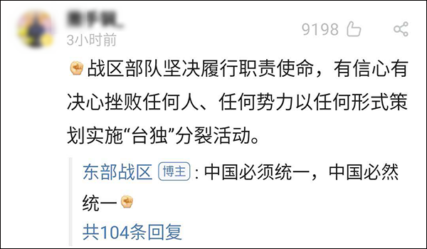 这条回复引来了一众网友“围观”,很多人惊呼“是那个啥意思吗”。此外,@东部战区 还在另两位网友的评论下分别回复:“时刻准备着”以及“中国必须统一,中国必然统一”。