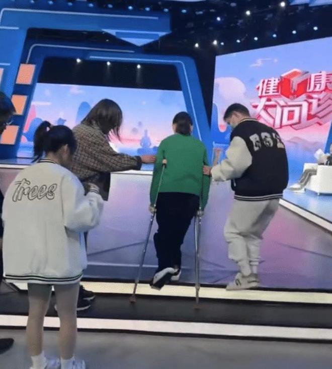 这位女主持人是马滢,到舞台前,为了方便录制,她从轮椅上下来换了拐杖。