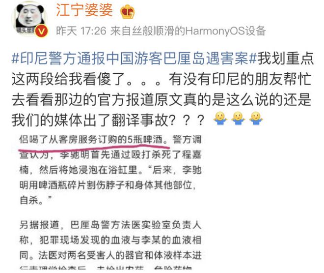有网友质疑,多家媒体的报道均表示,事件发生前两人点了5瓶啤酒,但法医检查称,在两人的器官和体液样本中未检出酒精。