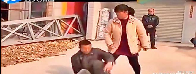一对中年夫妻殴打在一起,丈夫被妻子踹翻在地,连滚带爬,好不狼狈。