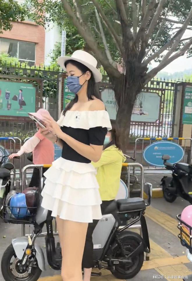 李女士本就身材高挑,容易吸引到他人的目光,而今天她的穿着相比周围人更是与众不同,黑白相间色露肩连衣短裙,白色遮阳帽,脚蹬平地凉鞋仍然是掩饰不住身高的出众。