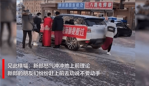 原标题:黑龙江一新郎婚礼现场,路虎挂挑衅横幅驶过,新郎崩溃愤怒动手