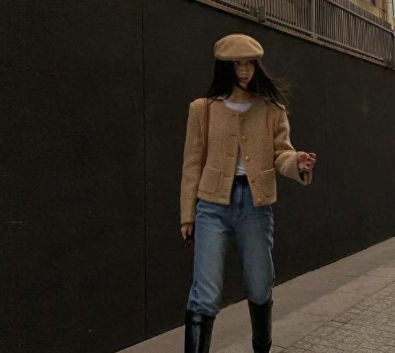 黑色长靴在秋冬季节可是很受欢迎的鞋子,百搭又帅气,与牛仔裤+小香风外套搭配,又利落又干练。