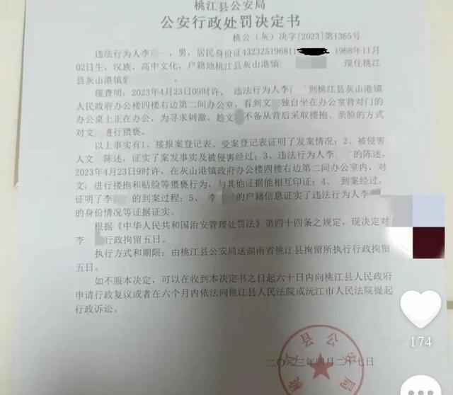 后来桃江县公安局对李某某执行行政拘留5日的处理;7月24日,经县委常委会研究决定,已对李某某做出党内严重警告、政务撤职(由二级主任科员降为四级主任科员)的处分决定。