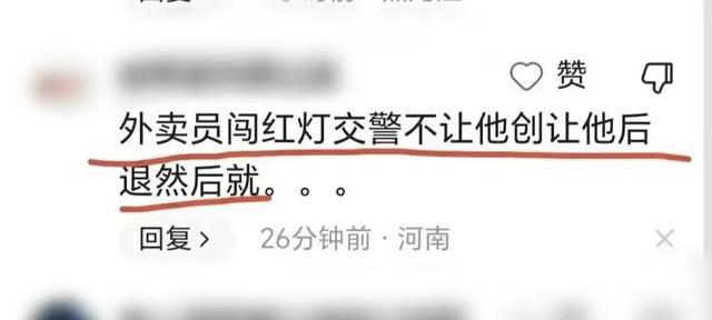 据这个目击者说,当时这个外卖小哥想闯红灯,但是一开始被他殴打的那个交警不让他闯,让他电动车往后退,所以才引发了后面一系列的殴打事件。