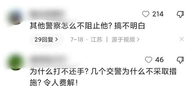 但是更多的网友觉得,看着自己的同事被打,其他的交警为什么不上去制止,不上去帮忙。