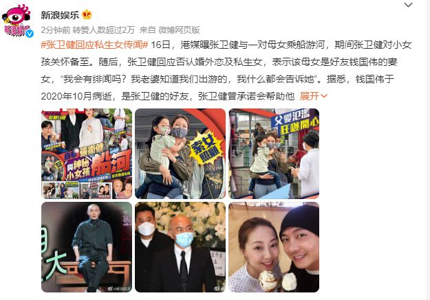 16日,港媒曝张卫健与一对母女乘船游河,期间张卫健对小女孩关怀备至。随后,张卫健回应否认婚外恋及私生女,表示该母女是好友钱国伟的妻女,“我会有绯闻吗?我老婆知道我们出游的,我什么都会告诉她”。