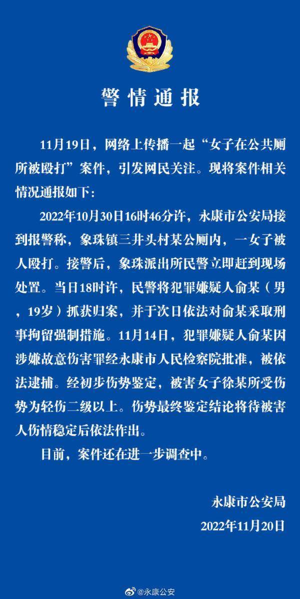 ◐◐◐◐●☛█▼▲豪仕法律网HTtp://Www.79110.net◐◐◐◐●☛█▼▲◐◐◐◐●☛█▼▲11月20日,当地警方做出通报称,案发当日18时许,民警将犯罪嫌疑人俞某(男,19岁)抓获归案,11月14日,犯罪嫌疑人俞某因涉嫌故意伤害罪被依法逮捕。经初步伤势鉴定,被害女子徐某所受伤势为“轻伤二级”以上。