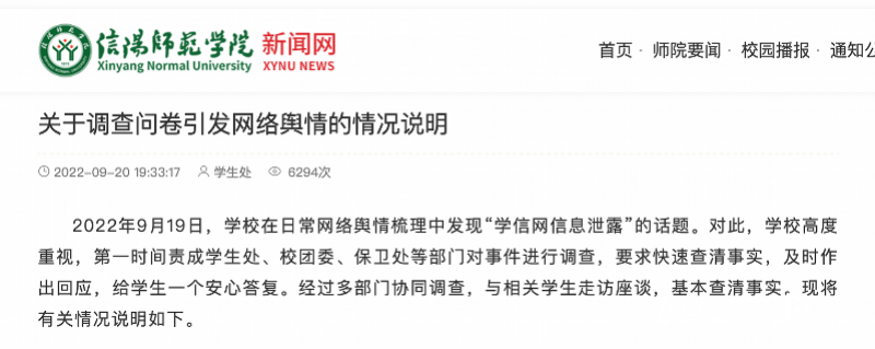 20日,信阳师范学院发布了“关于调查问卷引发网络舆情”的情况说明,称已将这位学生干部撤职,责令检讨,等待进一步处理。校团委也召开会议,要求做好学生信息统计、事件解释和情绪安抚工作,并通知填写问卷的学生登录学信网关闭学信码。