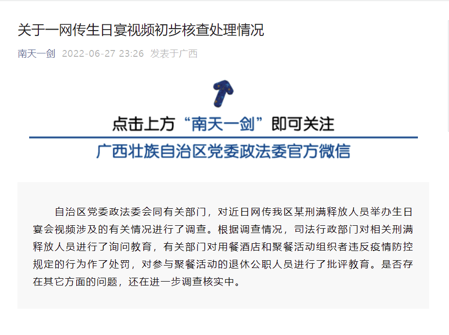 6月27日23时26分,广西政法委官方微信“南天一剑”发布通报称:自治区党委政法委会同有关部门,对近日网传我区某刑满释放人员举办生日宴会视频涉及的有关情况进行了调查。根据调查情况,司法行政部门对相关刑满释放人员进行了询问教育,有关部门对用餐酒店和聚餐活动组织者违反疫情防控规定的行为作了处罚,对参与聚餐活动的退休公职人员进行了批评教育。是否存在其它方面的问题,还在进一步调查核实中。