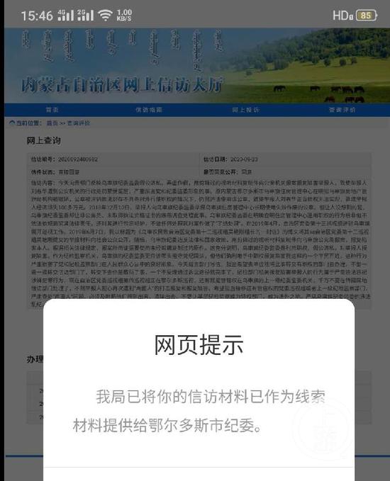 ▲9月27日,鄂尔多斯市信访局收到内蒙古自治区转过来的信访件,经审查后已将其作为线索材料向鄂尔多斯市纪委移送办理。