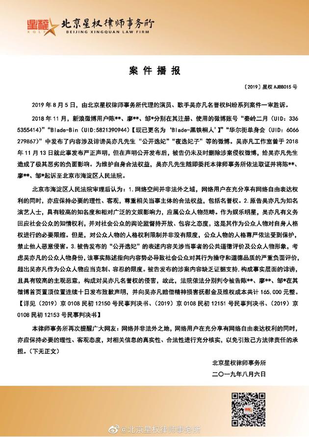 8月6日,北京星权律师事务所发布有关吴亦凡的名誉权纠纷案件通报,通报称,2019年8月5日,演员、歌手吴亦凡3例名誉权纠纷案件一审胜诉,被告陈**、廖**、邹*因公开发布诽谤吴亦凡的内容而被判构成对吴亦凡名誉权的侵犯,须持续十日向吴亦凡公开致歉并赔偿吴亦凡精神损害抚慰金及维权成本共计165000元,吴亦凡其余维权案件亦在依法进行中。