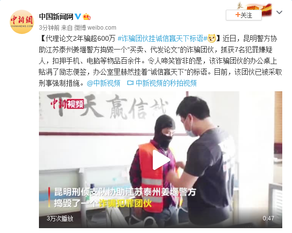 代理论文2年骗超600万 诈骗团伙挂诚信赢天下标语