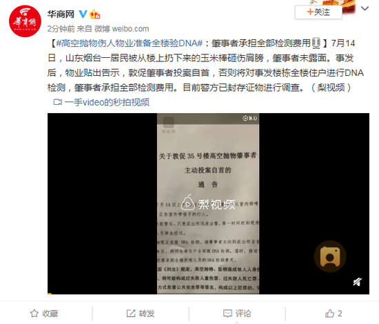 7月14日,山东烟台一居民被从楼上扔下来的玉米棒砸伤肩膀,肇事者未露面。事发后,物业贴出告示,敦促肇事者投案自首,否则将对事发楼栋全楼住户进行DNA检测,肇事者承担全部检测费用。目前警方已封存证物进行调查。