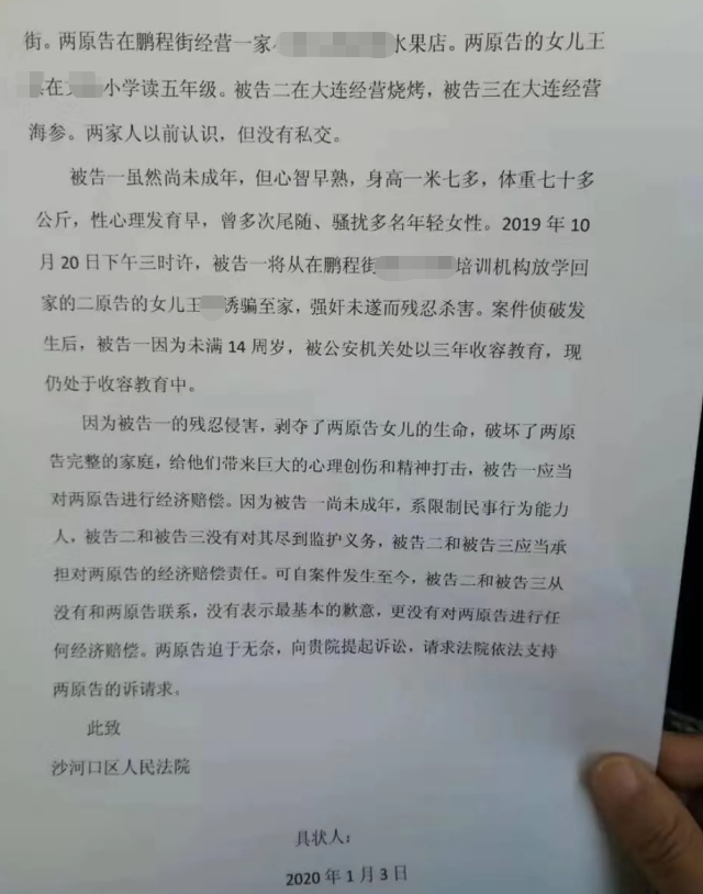 2019年10月20日,大连13岁男孩蔡某某杀害10岁女孩王某,并抛尸灌木丛。