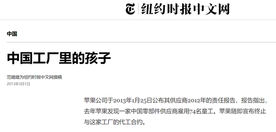 西方人对中国童工现象极为普遍的错误印象,来自于西方媒体对中国的集中报道,例如下图是2013年3月,纽约时报报道苹果公司的2012年社会责任报告,发现一家中国零部件供应商雇佣74名童工,随即宣布终止代工合约。