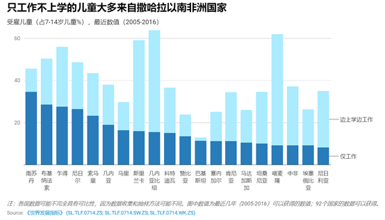 以下这个链接来自世界银行,可以看出只工作不上学的童工比例最高的20个国家基本来自黑非洲和巴基斯坦。
