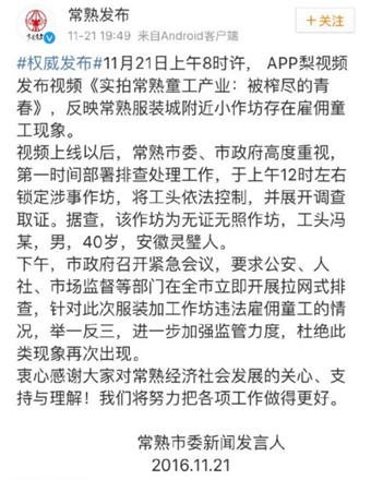 另外就是2016年11月被网络曝光的江苏常熟某无证无照小作坊存在雇佣童工事件,最终4名童工被妥善处置。
