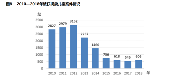 同样的还有儿童拐卖问题,我们印象中非常普遍的儿童拐卖现象,由于中国开始应用大数据和DNA技术,从2012年开始拐卖儿童案件就在大幅减少,下图来自中国2018年中国妇女、儿童发展纲要(2011—2020年)统计监测报告,在破案率不断提高的情况下,2018年全国破获的拐卖儿童案件,从2012年顶峰的3152件下降到606件了。