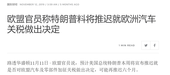 不过在不断延迟,最近的一次是在2019年11月11日,宣布对欧盟进口汽车征收25%关税的决定再延期六个月。
