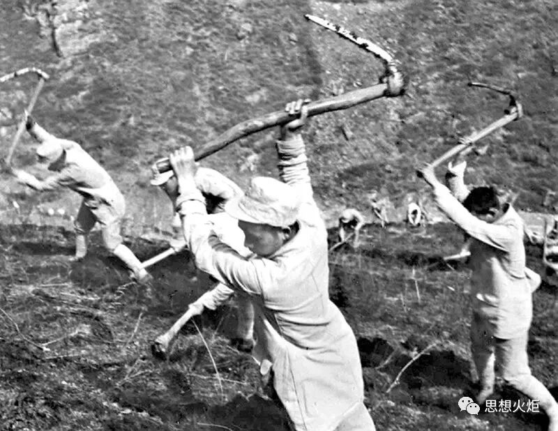 1941年前后,由于日本帝国主义的“扫荡”和国民党反动派的封锁包围及自然灾害,各抗日根据地出现了极端困难的局面。中国共产党提出“发展经济,保障供给”的方针,开展了大生产运动。图为晋察冀边区的八路军指战员在开荒生产。新华社发